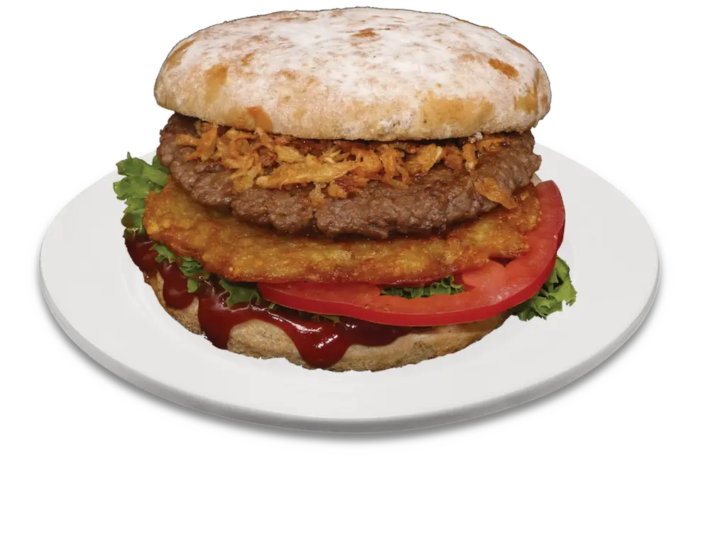 125g Angus-Rindfleisch, BBQ-Sauce, Tomate, Salat, Kartoffelpuffer, Bacon (Hähnchen), Röstzwiebeln