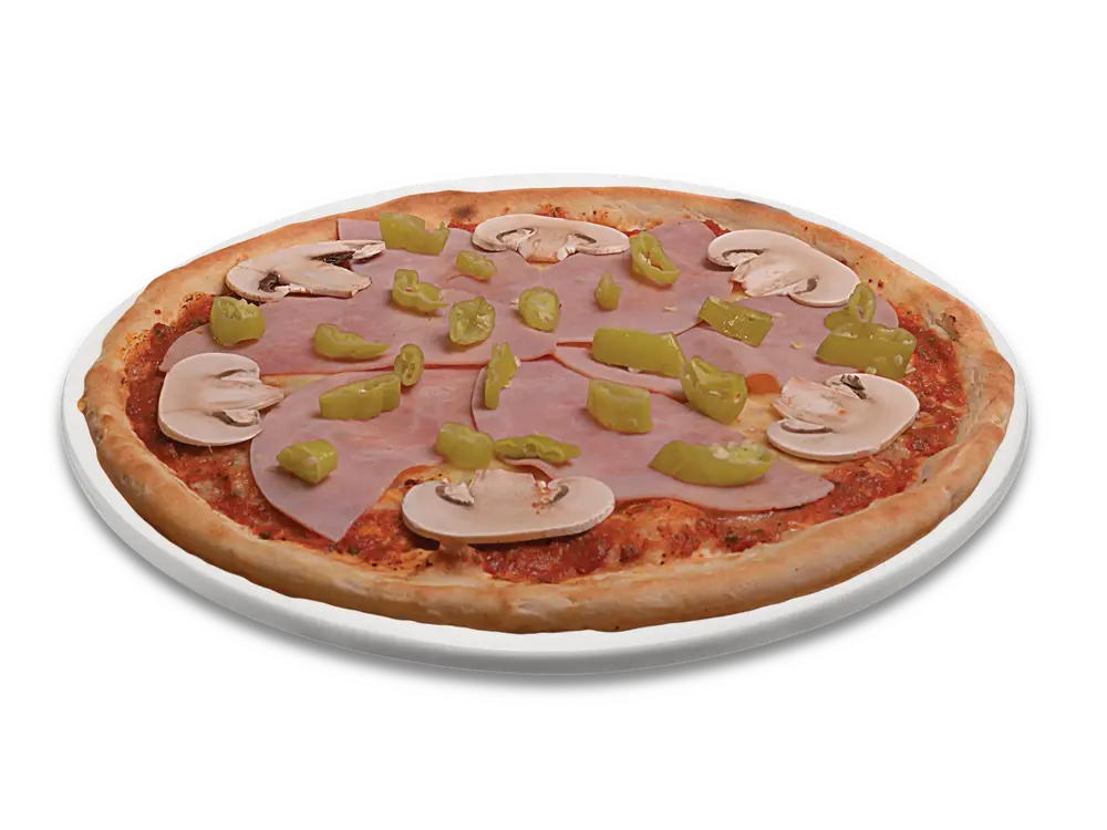 Frischer Teig, Tomatensauce, echter Käse, Kochschinken(Pute), Peperoni, frische Champignons