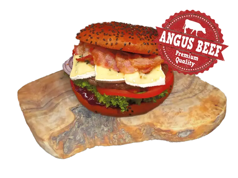 125g Angus-Rindfleisch, Preiselbeere, Bacon (Hähnchen), Blauschimmel-Käse, Salat, Tomate, Zwiebeln